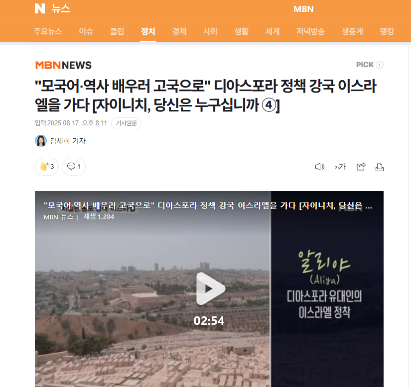 ‘디아스포라 유대인의 이스라엘 정착’이라는 주제로 MBN 특집 기사가 공개되었습니다.